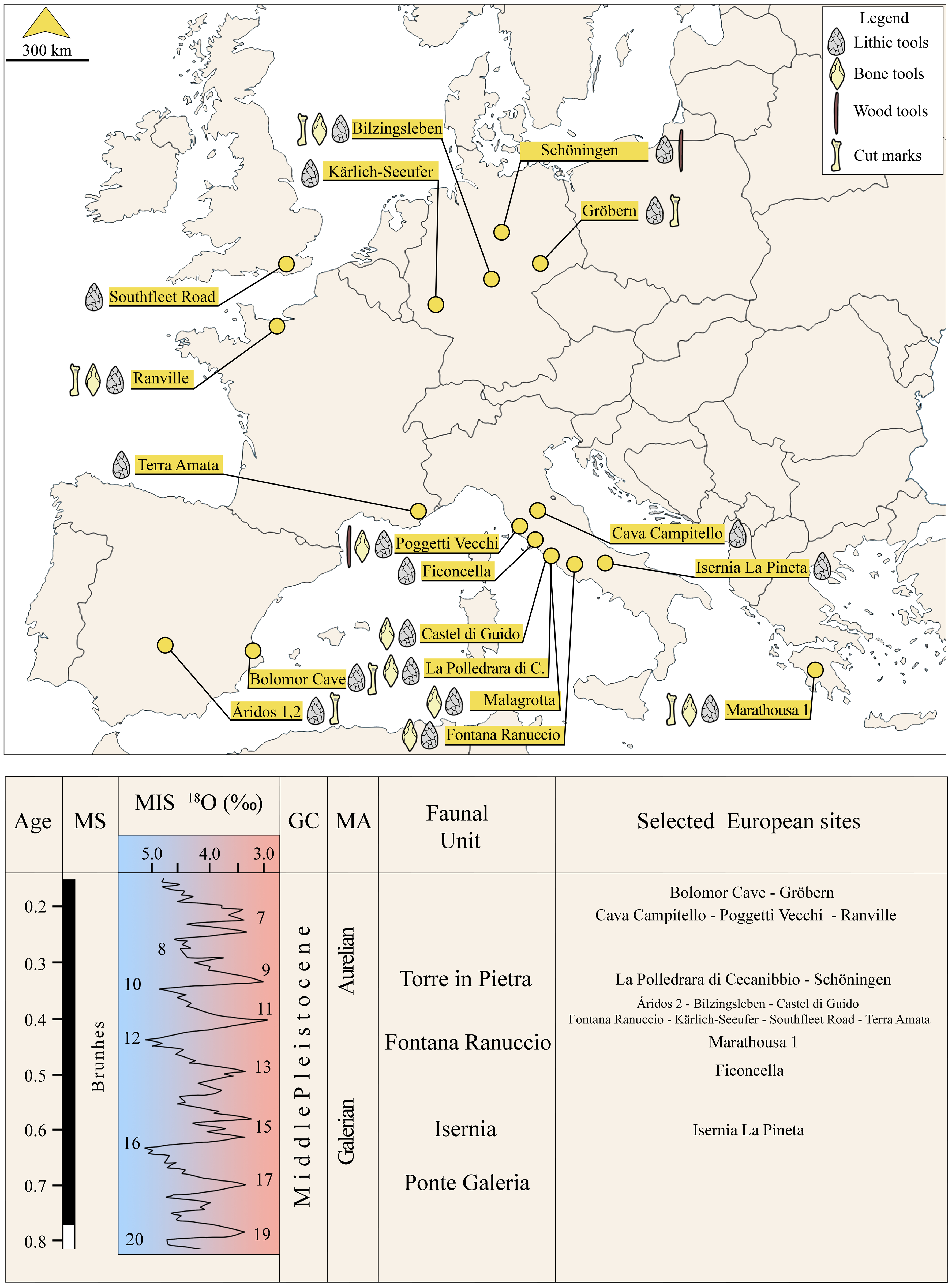 코끼리 뼈에는 썰고 필레할fileting 때 생긴 특징적인 절단 자국은 없지만, 망치 자국이 남아 있으며, 여러 개 작은 플린트 도구 옆에서 발견되었다.