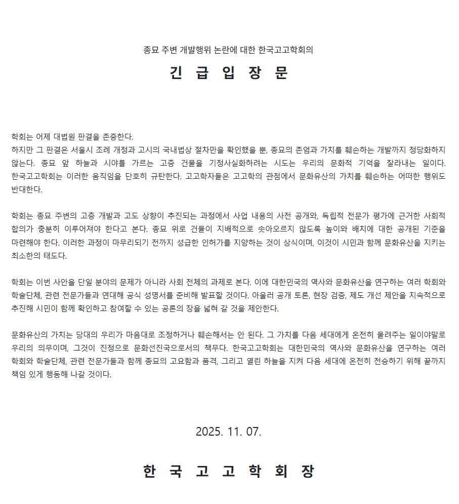 서둘러 권력의 품으로 달려들어간 한국고고학회 종묘 성명