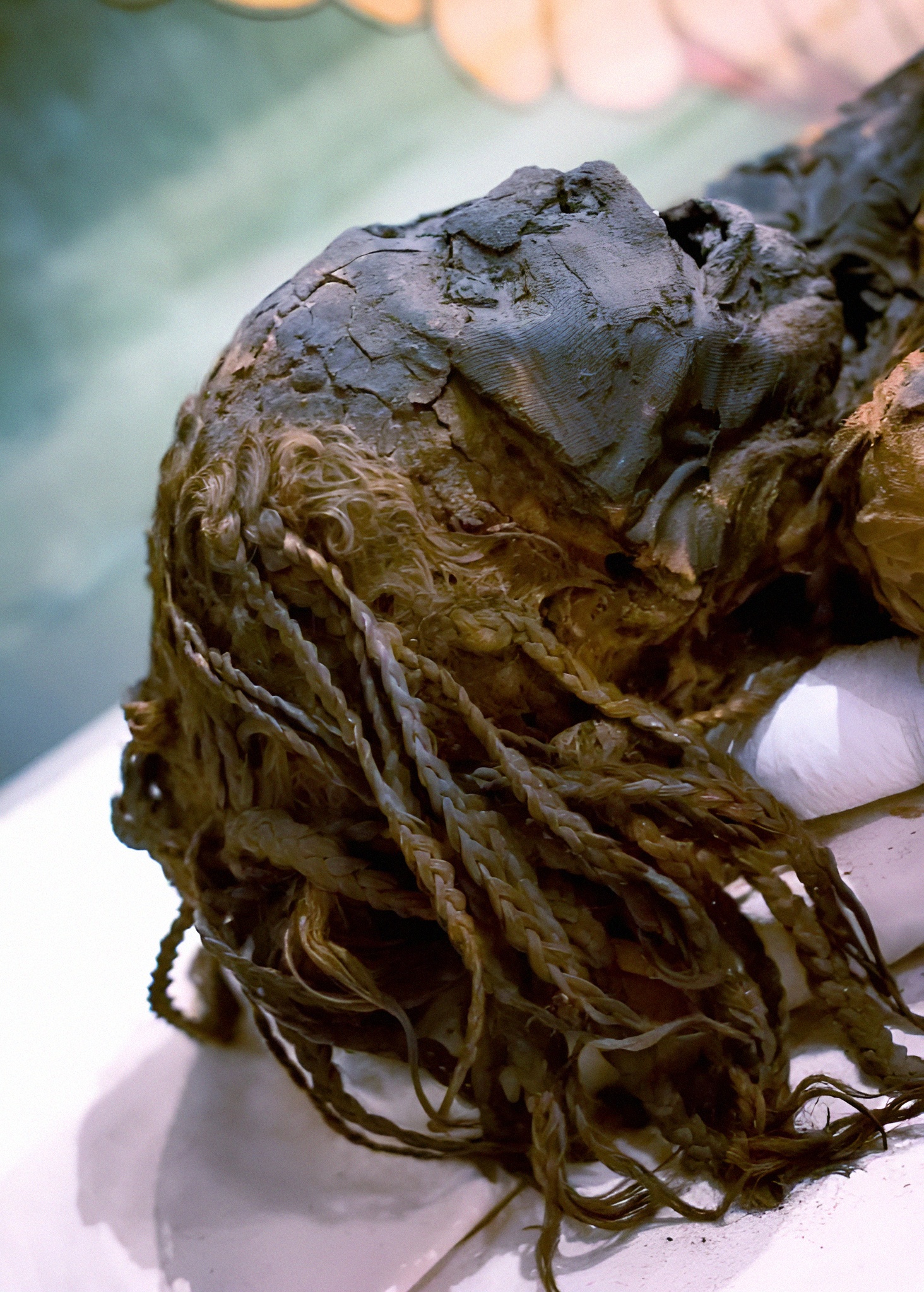 미국 캔자스 주 위치타 Wichita 소재 보물박물관 Museum of Treasures이 소장 전시 중인 고대 이집트 신왕국시대 20대 젊은 여성 미라 머리 쪽 세부다. 연대는 대략 1550-1069년.