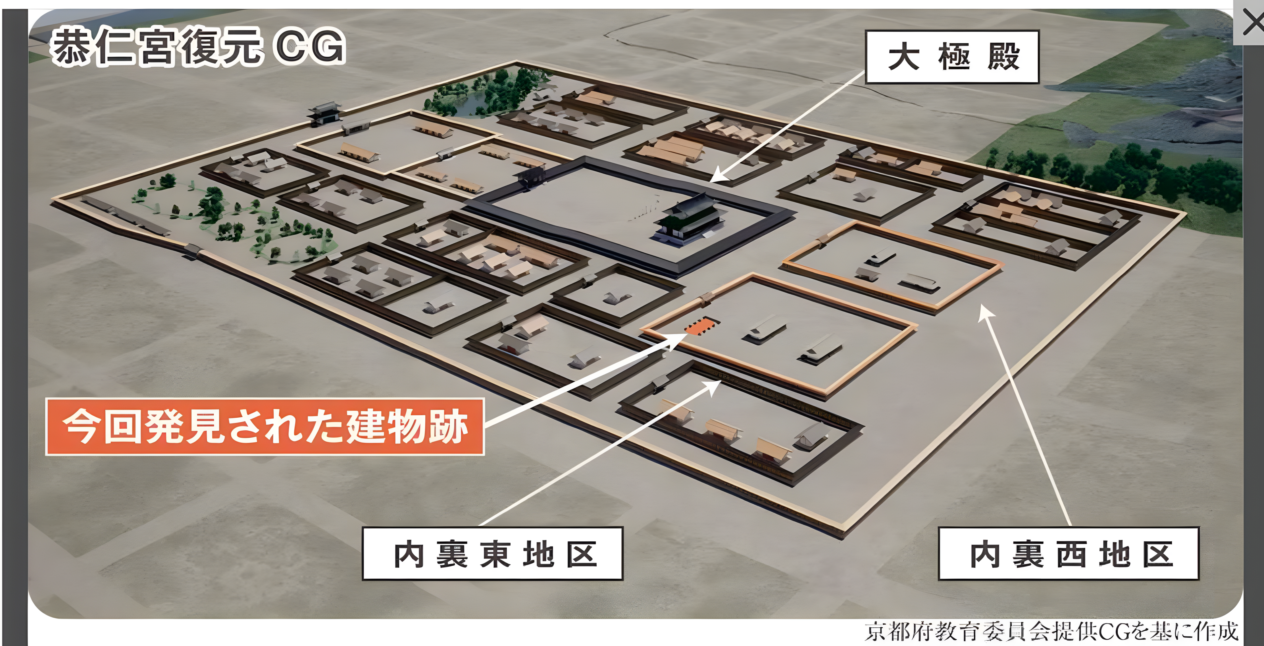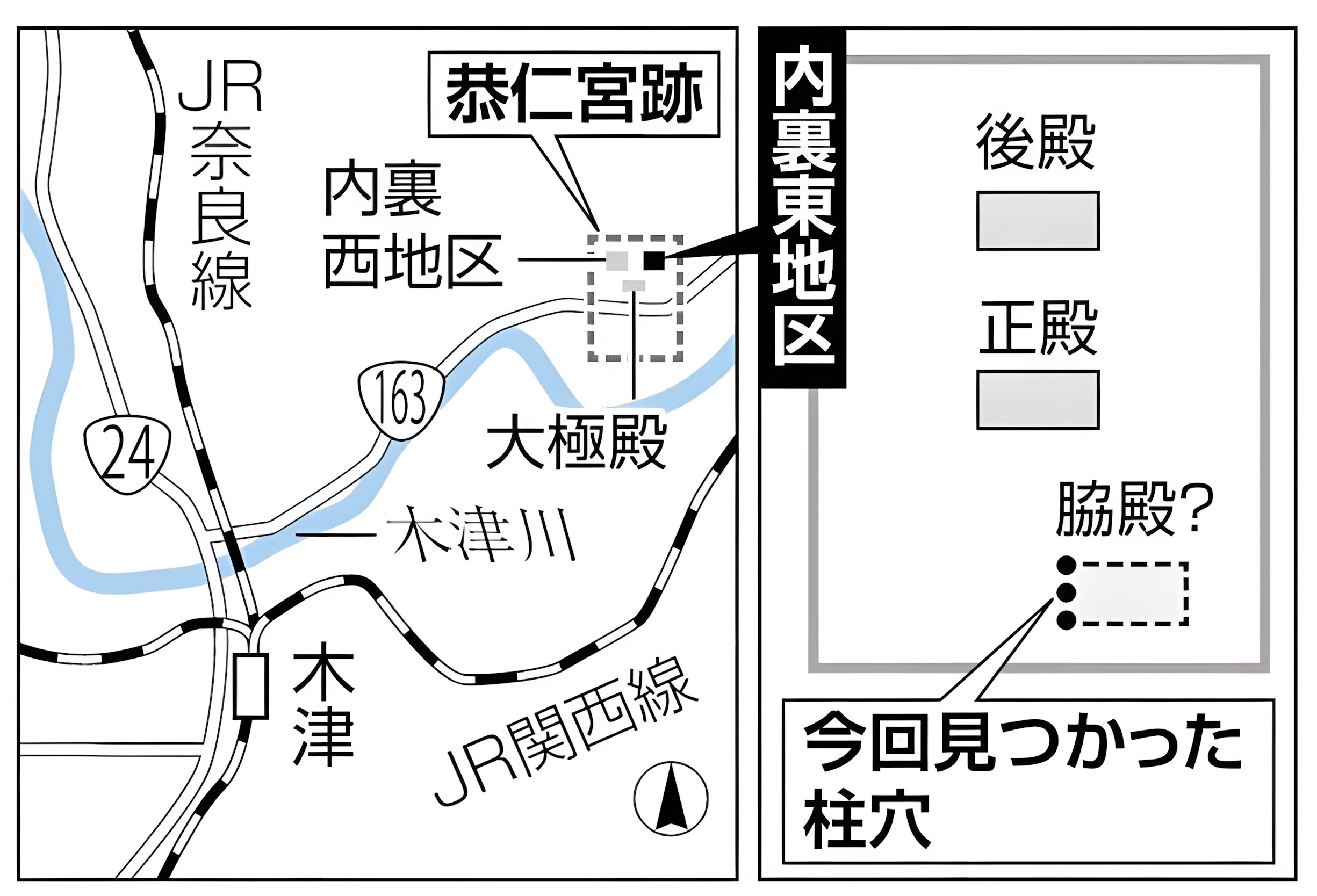 일본 고대 나라 시대奈良 성무 천황聖武天皇이 지금의 나라시 소재 평성경平城京[헤이조쿄]를 떠나 3년여 도읍을 둔 지금의 교토부京都府 목진천시木津川市 안쪽 내리内裏(천황의 사적 공간)에서 협전脇殿[와키덴わき殿]으로 추정되는 건물터가 발굴됐다고 교토부 교육위원회가 최근 발표했다.
