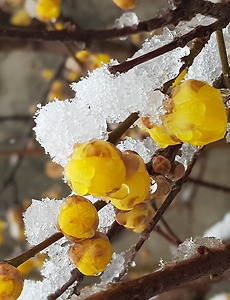 오늘 남부 지방을 중심으로 눈이 온단 예보에 이제나저제나 기다린 납매 소식, 마침내 날아들었으니, 전라도 장성 땅 유붕有朋이 내가 이를 기다리는 줄 알고는 부러 납매 핀 그 마을, 그 집으로 간 모양이라. 노랑이 완연한데, 눈물 머금은 표정이라, 어이한 일로 완연한 설중매雪中梅 되지 아니하고, 엉거주춤 설매雪梅 되었느냐는 물음에 유붕이 가로대, 눈이 아니라 진눈깨비라 한다. 얼음송이 젤라또 같은 모습이라, 그래, 어쩌면 흔하디 흔한 설중매보다는 엉거주춤 설매가 나을지도 모른다. 뭐, 그러고 보니, 볼수록 독특한 맛이 있어 저 납매가 어딘가 글을 보니, 약용으로 쓴다 했거니와, 얼음째 송이 먹어버리면 일거양득 아니겠는가 하하! 긴 말 필요없고 엉거주춤 설매 납매나 감상하자꾸나